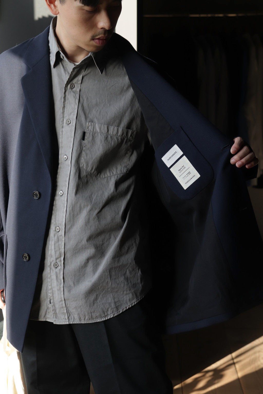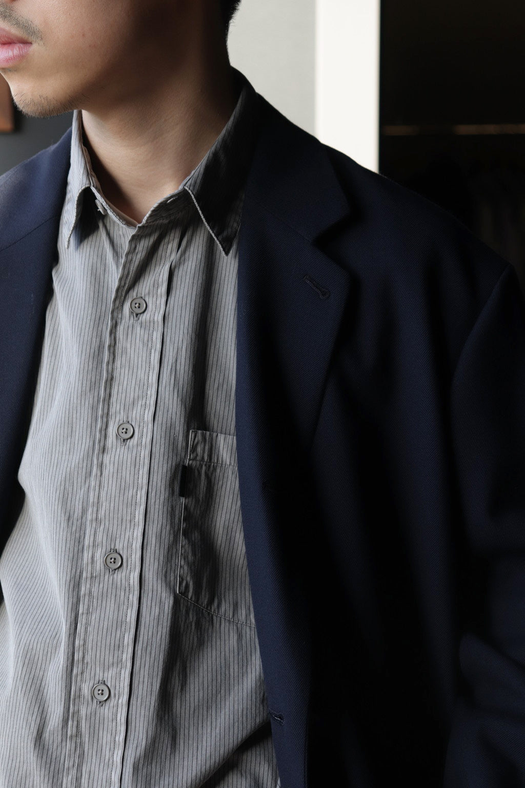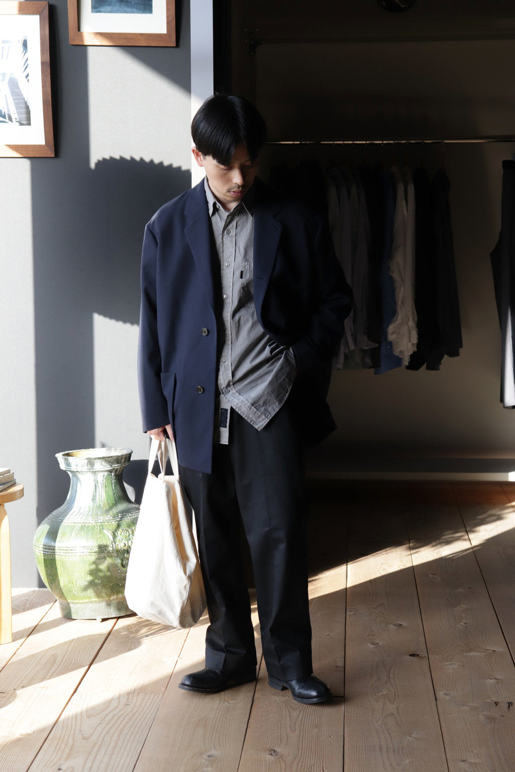 적당한 여유가 있는MARKAWARE의 'COMFORT BLAZER'에 컴팩트한 사이즈로 제작된 S H의 'REGULAR COLLAR SHIRT'를 매치했다.