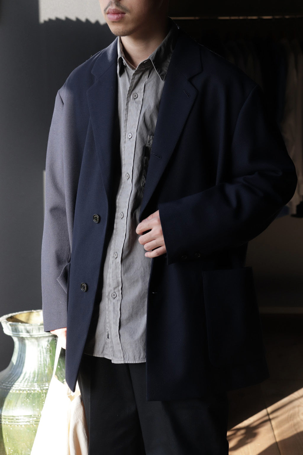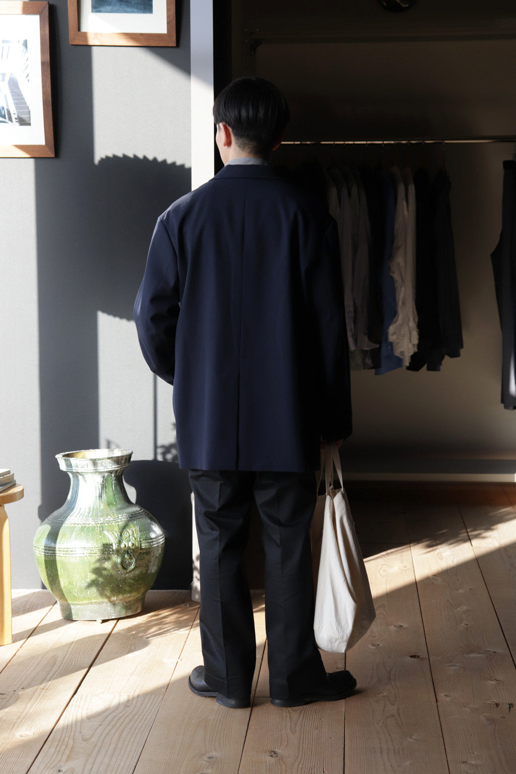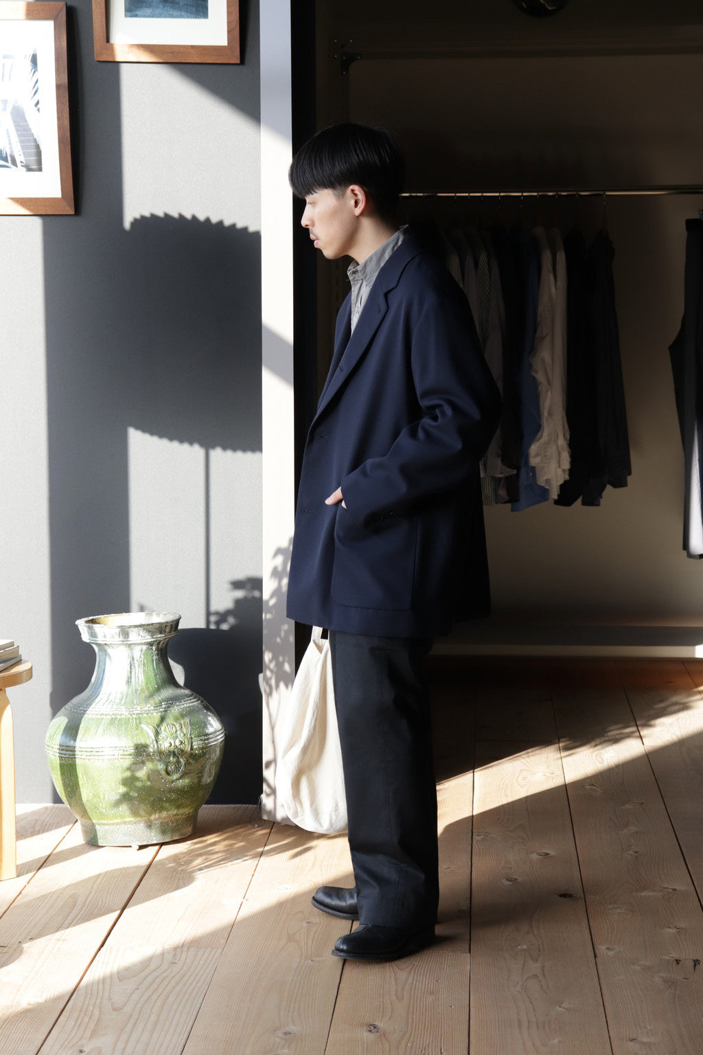 적당한 여유가 있는MARKAWARE의 'COMFORT BLAZER'에 컴팩트한 사이즈로 제작된 S H의 'REGULAR COLLAR SHIRT'를 매치했다.